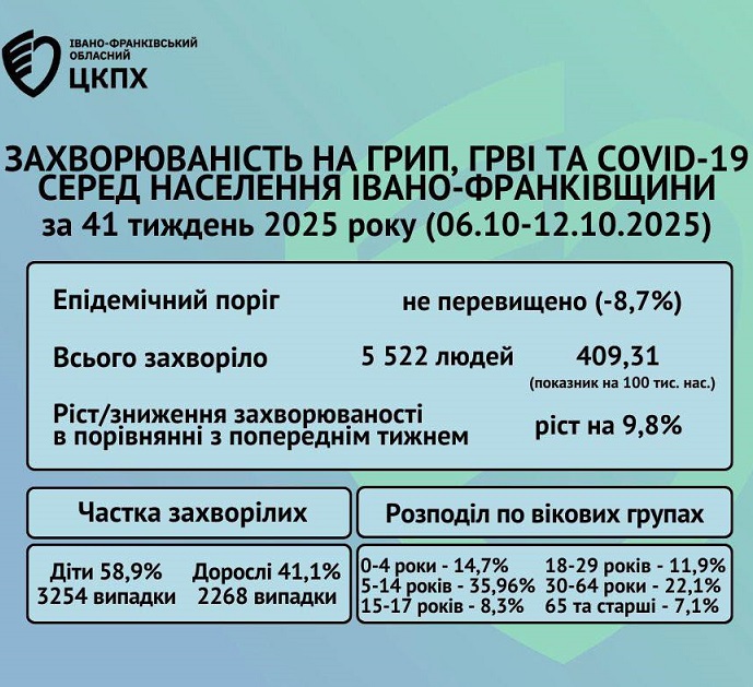 За даними оперативної інформації впродовж 41 тижня 2025 року (початок епідсезону 2025-2026 рр.) на ГРВІ, грип та COVID-19 захворіло 5522 особи, із них 3254 осіб діти 0-17 років (58,9%). У тому числі на COVID-19 захворіло 123 особи, серед яких 21 особа - діти 0-17 років (17,1%).