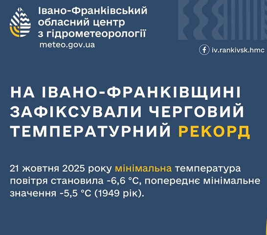 21 жовтня мінімальна температура повітря становила в Івано-Франківську -6,6 °С (2025 р.). Про це повідомили в Івано-Франківському обласному центрі з гідрометеорології