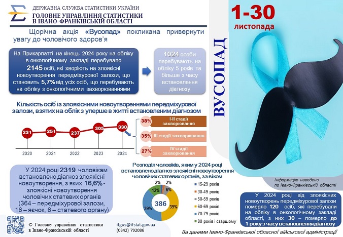На кінець 2024 року на обліку в онкологічному закладі перебувало 2145 осіб, які хворіють на злоякісні новоутворення передміхурової залози. Це становить 5,7% від усіх осіб, що перебувають на обліку з онкологічними захворюваннями. 1024 особи перебували на обліку 5 років та більше з часу встановлення діагнозу.