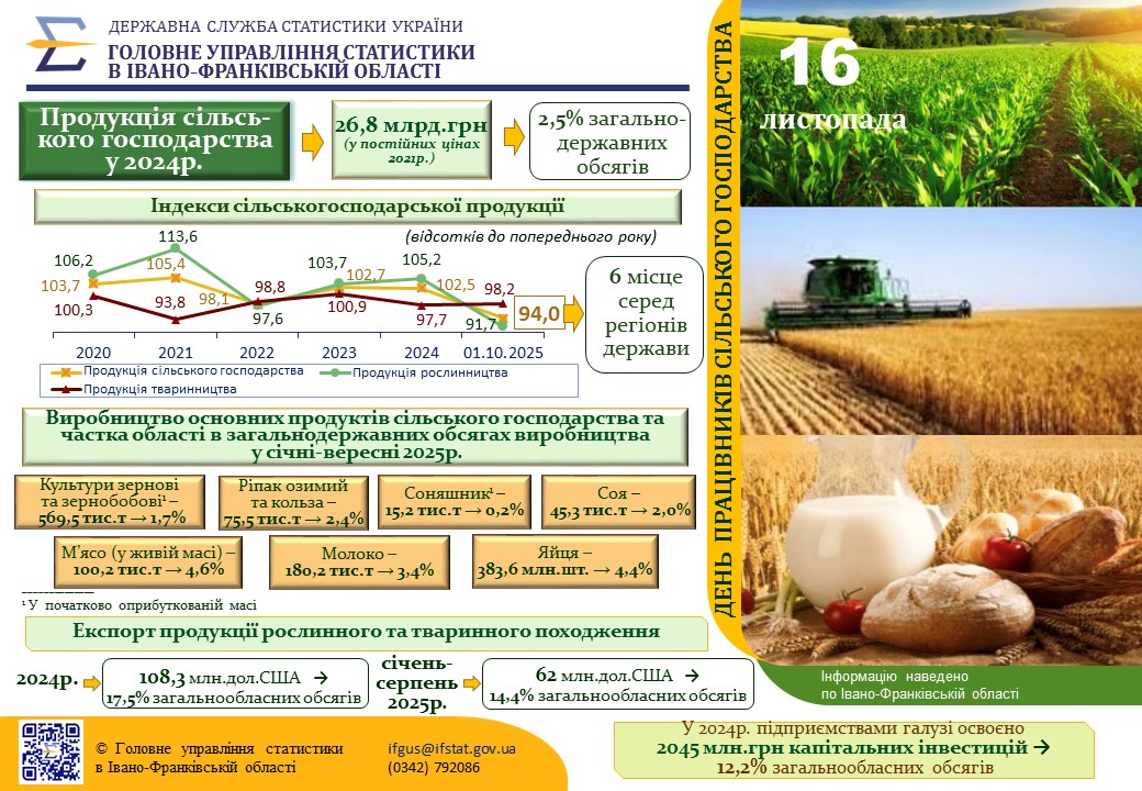У 2024 році продукція сільського господарства Івано-Франківської області становила 26,8 млрд.грн (у постійних цінах 2022р.) або 2,5% загальнодержавних обсягів. Про це повідомили в Головному управлінні статистики Івано-Франківської області.