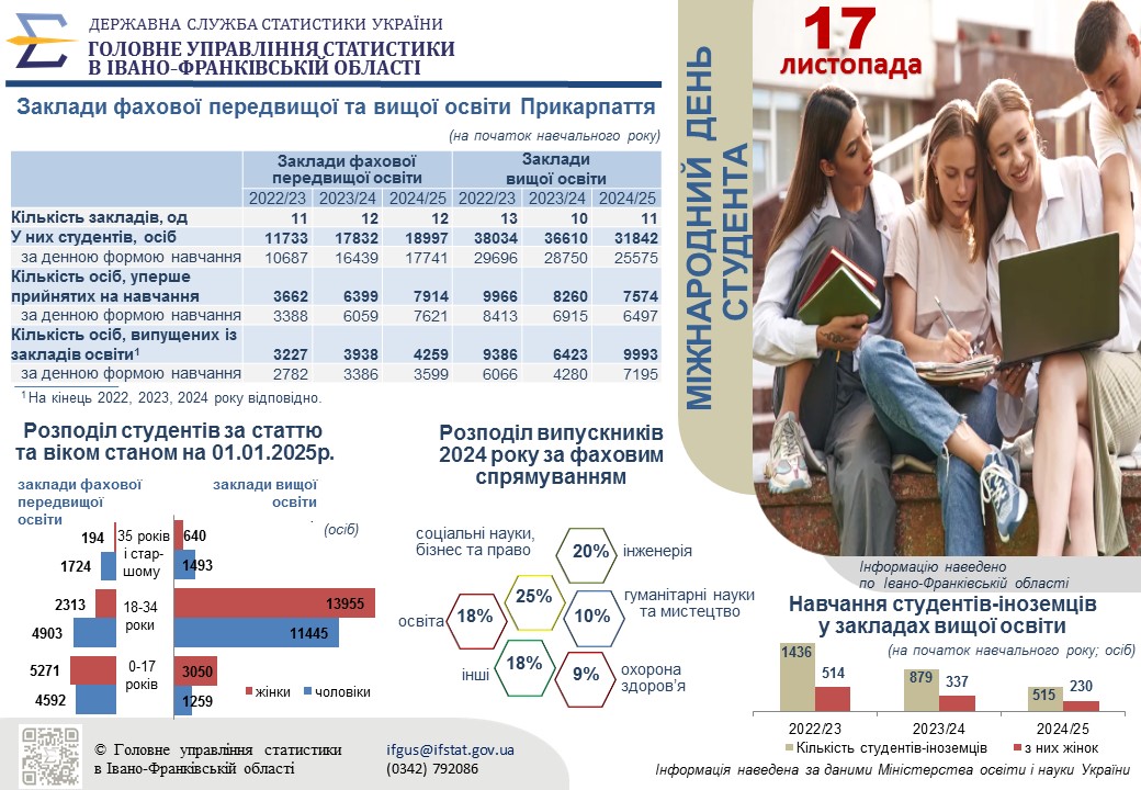 Станом на початок навчального року на Івано-Франківщині у закладах вищої освіти та закладах фахової передвищої освіти навчаються більше 50 тисяч студентів. Про це повідомили у Головному управлінні статистики в Івано-Франківській області.