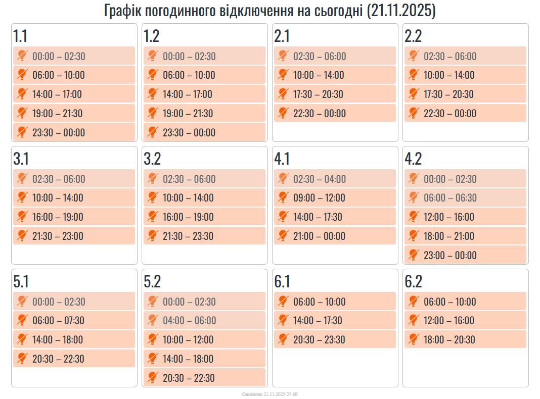 Новини Суспільство Опубліковано: 21.11.2025 о 08:51 «Прикарпаттяобленерго» оновило графіки відключень електропостачання на 21 листопада АТ «Прикарпаттяобленерго» оприлюднило оновлені графіки відключень електроенергії на 21 листопада 2025. Сподобалась публікація? Надіслати у Viber Надіслати в Telegram Поширити на Facebook