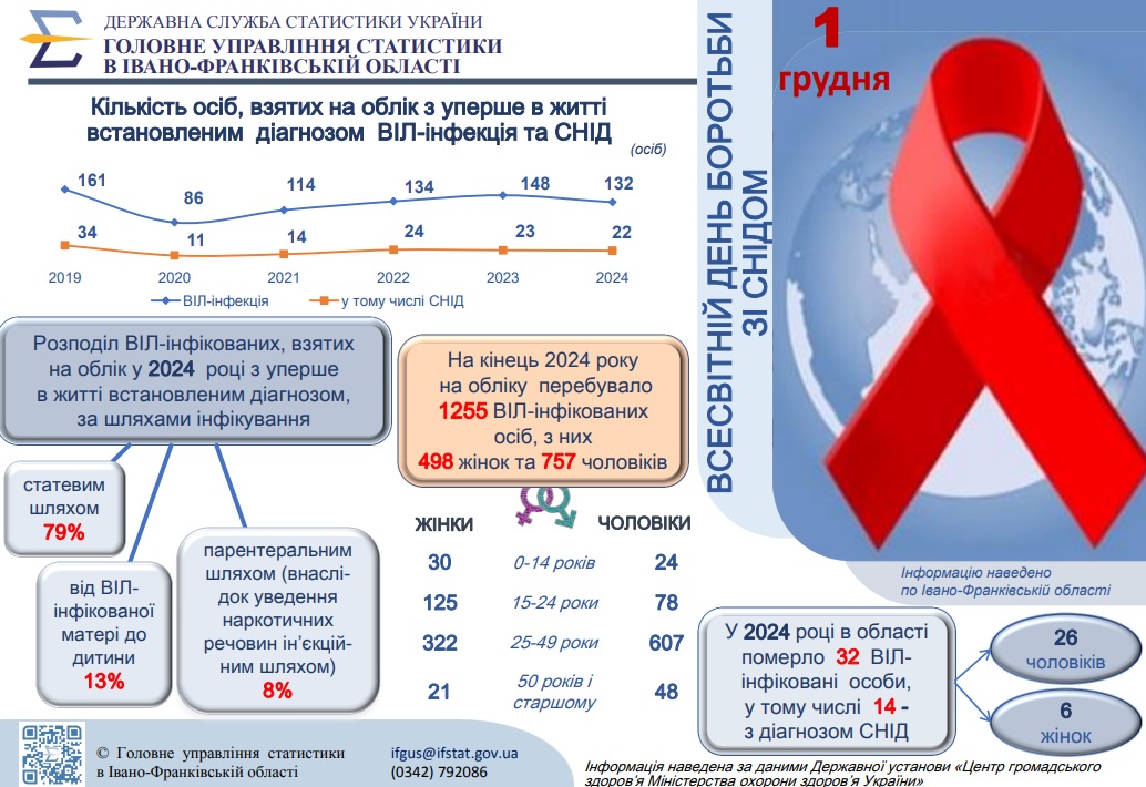 Новини Здоров'я Опубліковано: 28.11.2025 о 16:05 На Івано-Франківщині на обліку більше тисячі хворих на ВІЛ-СНІД На кінець 2024 року на Івано-Франківщині на обліку перебувало 1255 ВІЛ - інфікованих осіб. Про це повідомили у Головному управлінні статистик в Івано-Франківській області. Сподобалась публікація? Надіслати у Viber Надіслати в Telegram Поширити на Facebook