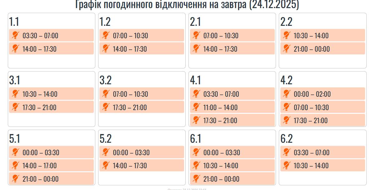 24 грудня, на Івано-Франківщині будуть застосовуватися графіки погодинних вимкнень для побутових споживачів та графіки обмежень потужності для промисловості в повному обсязі для 5 черг.