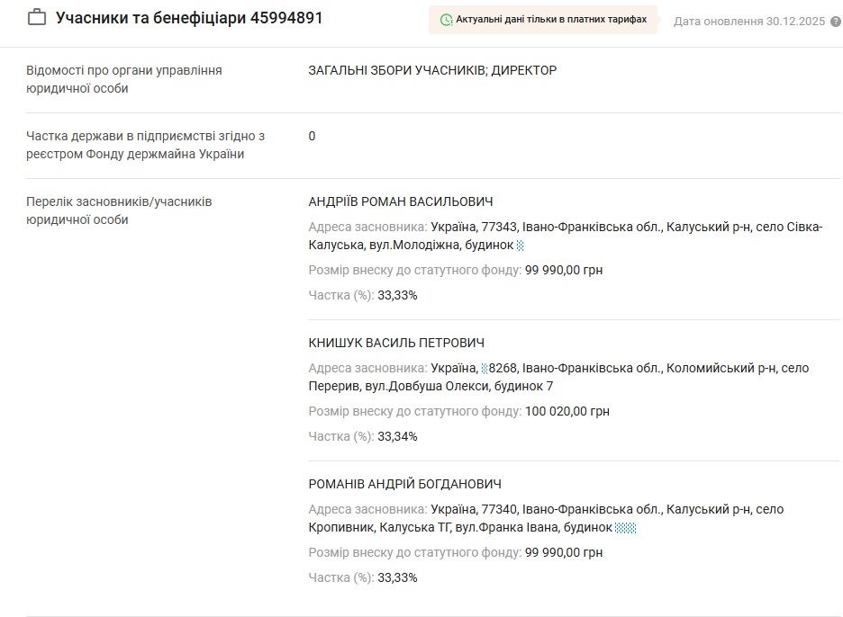 За даними Youcontrol, ТОВ «АВР «Трембіта» зареєстроване 23.12.2025 року. Основним видом діяльності вказане «Надання в оренду інших машин, устатковання та товарів». Власниками товариства є житель Калущини Андріїв Роман Васильович, житель Коломийщини Книшук Василь Петрович та житель Калущини Романів Андрій Богданович.