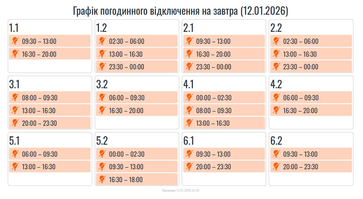 12 січня, в усіх регіонах України, в тому числі на Прикарпатті, будуть застосовуватися графіки погодинних вимкнень.