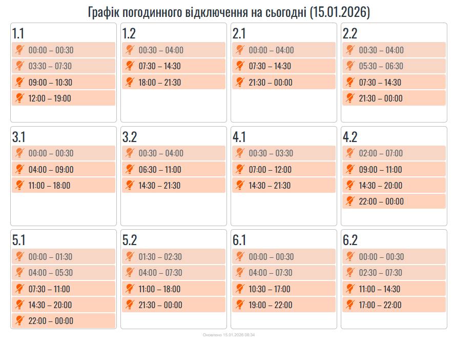 Новини Культура Опубліковано: 15.01.2026 о 10:05 15 січня на Івано-Франківщині застосують графіки відключень світла За вказівкою НЕК «Укренерго», доведені зміни в графіку погодинних вимкнень на 15 січня. Про це повідомили в АТ Прикарпаттяобленерго. Сподобалась публікація? Надіслати у Viber Надіслати в Telegram Поширити на Facebook