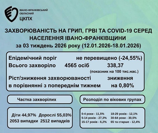 За результатами моніторингу захворюваності за 3 тиждень 2026 року (епідсезон 2025–2026 рр.) на ГРВІ, грип та COVID-19 захворіли 4565 осіб, з них 2053 — діти віком 0–17 років (44,97%).