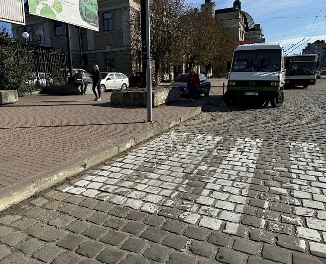 - Замінити покриття пішохідних переходів на асфальтне, адже пересування по крупному каменю є складним для людей на кріслах колісних та пасажирів з валізами. Окрім цього, асфальт дозволить нанести чітку і довговічну дорожню розмітку;