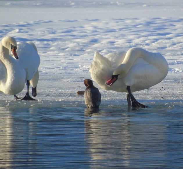 «Одна з таких ділянок – відтинок Дністра від гирла Серету у с. Городок до с. Виноградне, де працівниками науково-дослідного відділу Парку були проведені обліки видового та чисельного складу птахів. Тут у люті морози перебували близько 120 лебедів – шипунів. Небайдужі мешканці с. Василів підтримували цих красенів кормами (зерном). Найчисельніші як і повсюдно – крижні, близько п’яти сотень особин. Крім цих диких качок тут було виявлено і інші види. Найцікавішим було скупчення (близько 100 особин) червонокнижних гоголів зеленоголових, яких у нас можна зустріти тільки взимку. А ще виявлено близько 50 особин черні чубатої, поодинокі крехи великі та крехи малі, свищ та попелюхи. У гирлі Серету тримались декілька лисок – птахів 2026 року за версією Українського товариства охорони і вивчення птахів. Таке скупчення птаства – зручний випадок для бьордвотчингу (птахо споглядання), що приносить неймовірну естетичну насолоду. Важливо тільки не наближатись до скупчень птахів на кризі, які завмерли для зменшення енергетичних затрат. Часте сполохування небезпечне для них. Було знайдено залишки трьох загиблих лебедів, що для такого скупчення можна вважати звичним чинним природного добору. Такі втрати для популяції в цілому невідчутні», - повідомили в НПП «Дністровський каньйон».