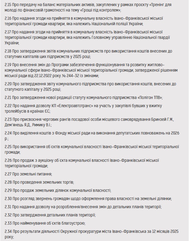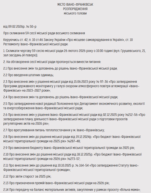 26 лютого 2026 року відбудеться чергова 59 сесія Івано-Франківської міської ради.
