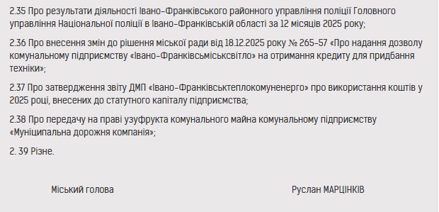 Міський голова Івано-Франківська Руслан Марцінків підписав розпорядження про скликання чергової 59 сесії міської ради на 26 лютого 2026 року.