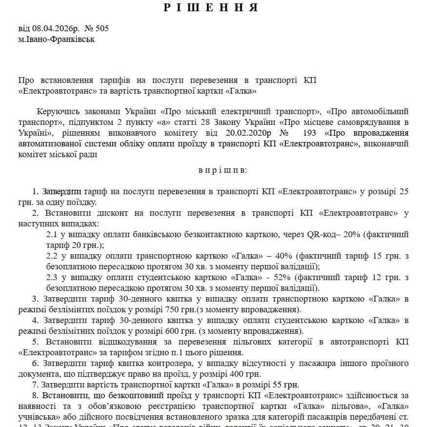 Івано-Франківський міськвиконкому ухвалив рішення «Про встановлення тарифів на послуги перевезення в транспорті КП «Електроавтотранс» та вартість транспортної картки «Галка».