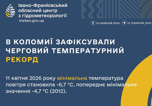 11 квітня 2026 році мінімальна температура повітря в Коломиї 🌡️ становила -6,7 ⁰ С . Про це повідомили в Івано-Франківському обласному центрі з гідрометеорології.