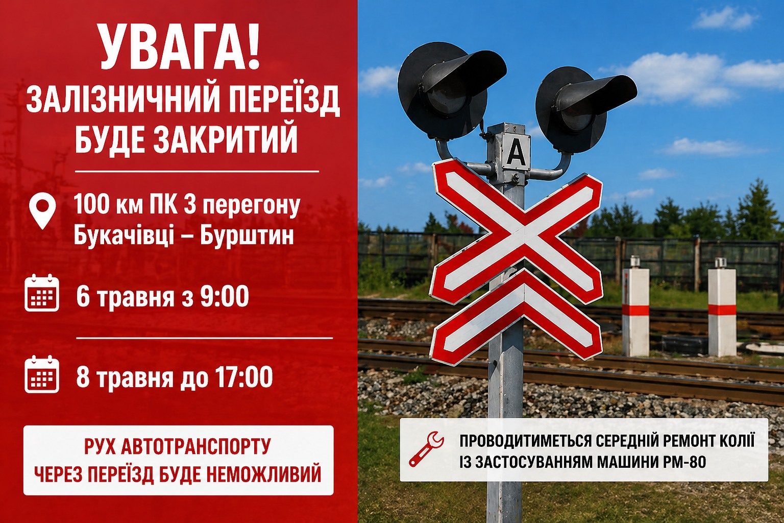 Згідно повідомлення Івано-Франквської дистанції колії АТ «Укрзалізниця» із 09:00 6 травня до 17:00 8 травня 2026 року буде повністю закрито залізничний переїзд Букачівці – Бурштин у зв’язку з проведенням ремонтних робіт колії.