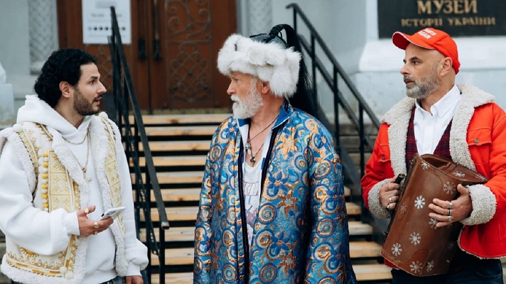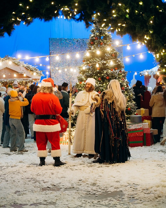 Отже, магічний образ Санта Клауса – складно не впізнати, це вічна класика: червоний костюм з білим хутром. Повсякденний образ одразу кричить про те, що це гість з Америки, тож він одягнений у джинси, червону куртку з хутряними елементами, а на голові – кепка з написом «Make Santa Great Again». Дух Зими також вийшов колоритним. Його казковий образ зітканий з образів мольфара та чарівника з відсилками до трипільської культури, що підкреслює його тисячолітню історію. А на щодень Дух Зими обирає зручний спортивний костюм, шовковий халат і хутряну шапку. Найбільше ж мені сподобалося те, як у стрічці виглядає Святий Миколай. Його образ як чарівника виконано в біло-золотій гамі. Костюмери відмовилися від хрестів і обрали нейтральну шапку, що не належить ані до католицької, ні до православної релігійної традиції. Його повсякденний вигляд поєднує біле худі, широкі джинси та гуцульський кептар, що дуже круто і сучасно відображає українську ідентичність персонажа.