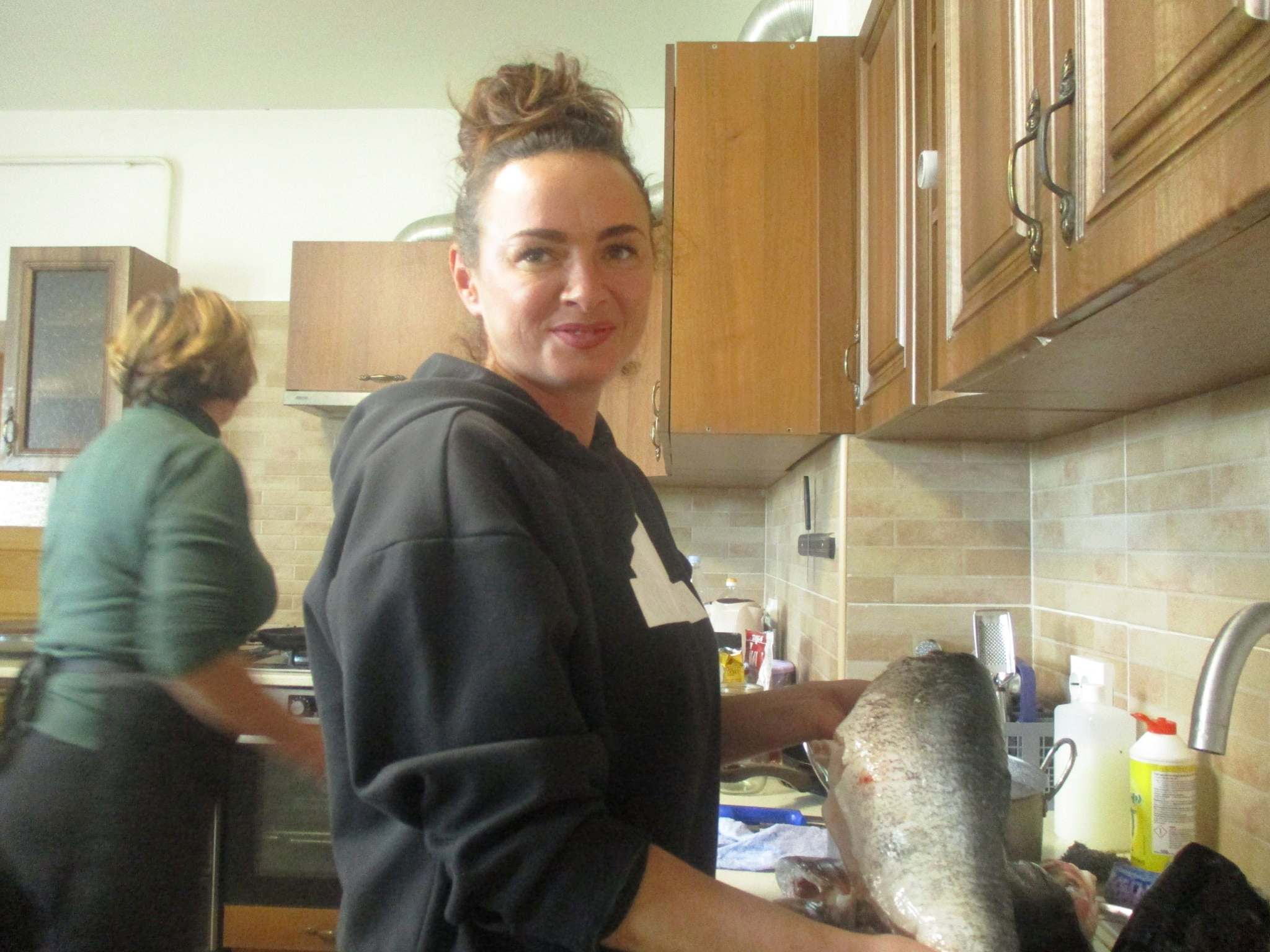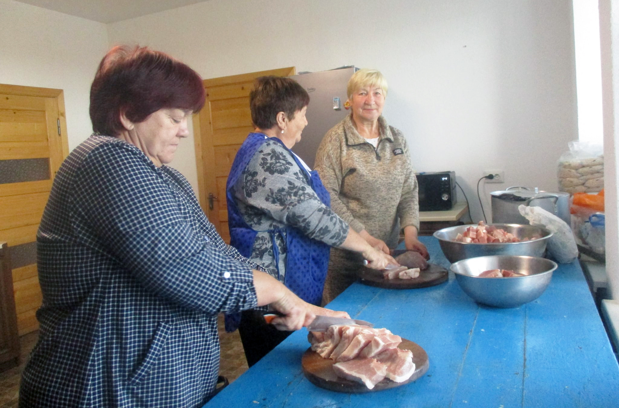 За столами у великій кімнаті парохіяльного будинку для священників працюють сільські волонтерки Христина Марчук, Ніна Кірсанова, Любов Дутчак, Марія Дикан, Марія Дутчак, Галина Козловська. Серед працівниць акуратно нарізають м’ясо та рибу і втікачки від війни з Донеччини та Миколаївщини. Дізнаюся, що одна підготовлена для автоклава порція тушкованок – це 56 півлітрових слоїків. Але тільки зранку наступного дня – після повільного охолодження – вироби будуть готові для споживання й відправлення на фронт. Стежу за вправними і впевненими рухами працівниць та загалом злагодженою роботою спільноти і розумію, що тут не вперше виконують таке волонтерське замовлення, а також, що й у своїх родинах вони добрі ґаздині.