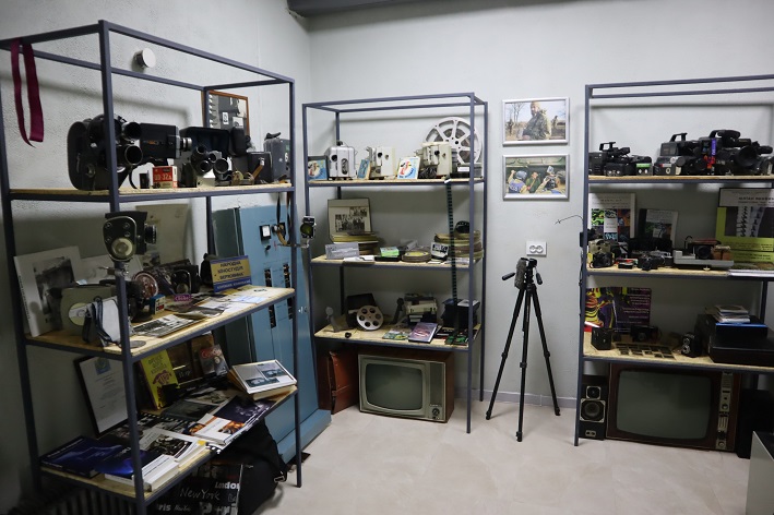 Мій погляд від кіноапаратів переходить до стелажів, на яких зберігається велика кількість експонатів, що уособлюють кіномистецтво. Серед них – одна з найбільших колекцій кінокамер і фотоапаратів у Західній Україні, а можливо, і в масштабі всієї України.