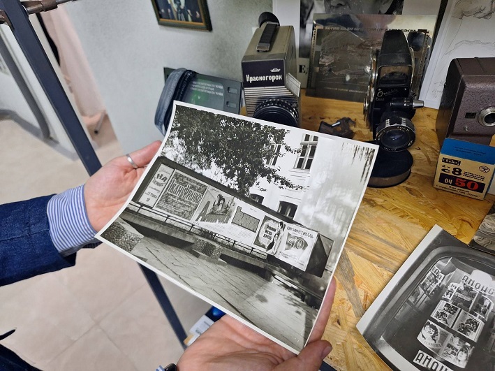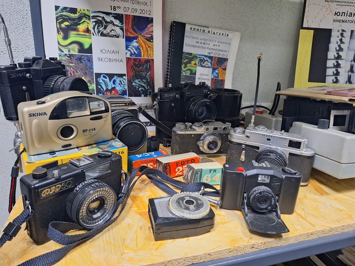 «У центрі нашої експозиції – численна та унікальна колекція фото- й кінокамер. Це не просто предмети, а справжні свідки кінематографічної епохи, – захоплено розповідає О. Терешкун, підходячи ближче до одного зі стелажів. – Погляньте на цю красу! Ось легендарні кінокамери: від «Аврори 215» до «Красногорка», який був напівпрофесійною камерою, що використовувалася для зйомок хроніки. А поруч з ними – «Конвас. Автомат», який служив знімальній групі для створення неперевершених кадрів. Тут ви також побачите перші відеокамери, такі як «Camera Recorder» ІТТ та «Hitachi». А ось фотоапарати, які відкрили для багатьох світ фотографії: «Зоркий – 4К» та «Зенит ЕТ» – справжні легенди радянського фотопрому. Зверніть увагу на «Zeiss Ikon Tengor D.R.P.» – зразок німецької інженерної думки, який витримав випробування часом. Ці експонати розповідають про те, як кіно і фотографія розвивалися паралельно, доповнюючи одне одного».