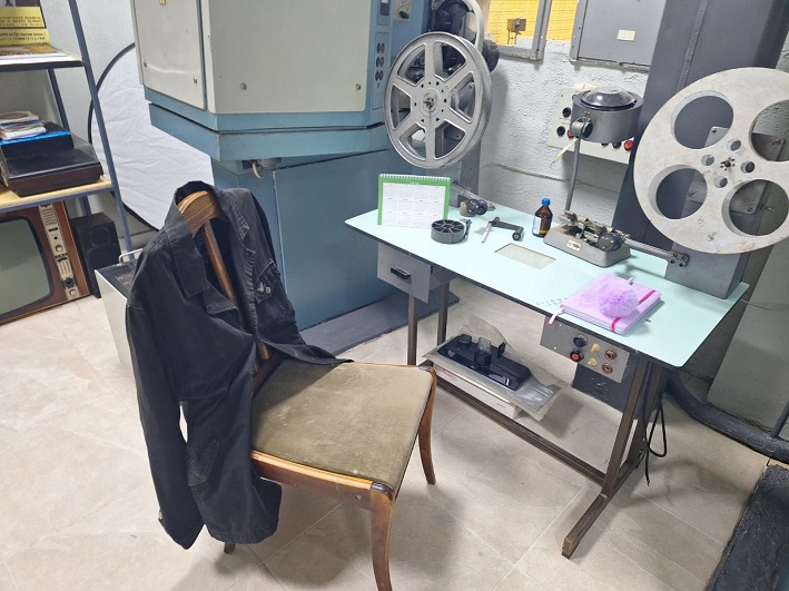 У цьому приміщенні раніше була кінорубка, тож тут збереглися два стаціонарні кіноапарати. Пані Оля каже, що такі ж, як колись були в кінотеатрі «Космос». Вони не працювали, тому їх капітально відреставрували, замінивши майже всі деталі. І тепер вони знову в строю та готові проектувати кіно. Тим паче, що внизу є велика зала на 200 місць з широкоформатним екраном. Пані Ольга розповідає, що кінотеатр в училищі, яке збудовано в кінці 80-х, точно не випадковість, адже в радянські часи дуже добре розуміли, що кіномистецтво – це потужний інструмент ідеології та пропаганди. Також вона каже, що кіносеанси та тематичні вечори тут проводили до кінця 90-х, а потім це все завмерло через різні історичні (й не дуже) обставини. Дуже тішить, що сьогодні Івано-Франківський осередок НСКУ поступово відроджує найкращі кінотрадиції Прикарпаття.