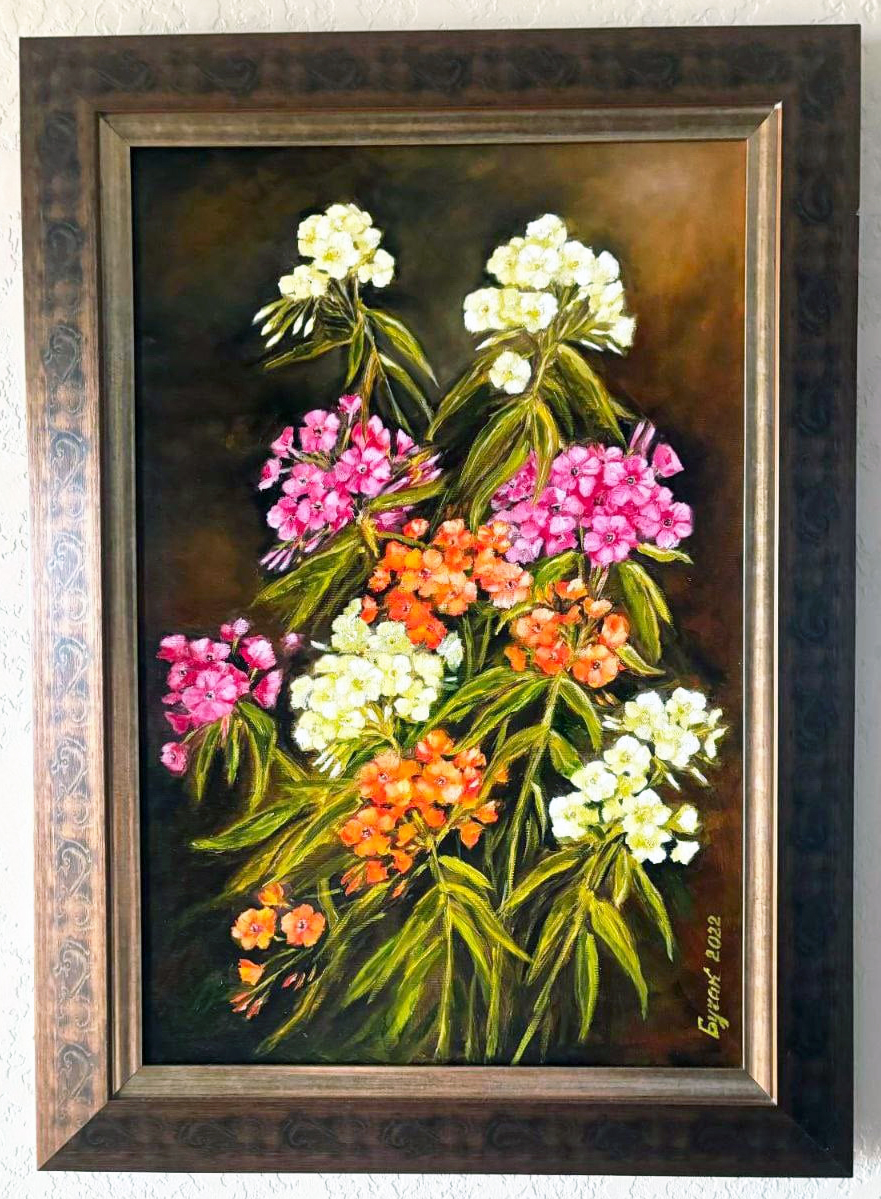 Згодом на моїх полотнах переважно народжувалися квіти. Серед улюблених – хризантеми, які у мене асоціювалися з українськими жінками: стійкими, витривалими, мужніми, суголосними з реаліями часу. Мороз, холод, вітри, бурі, а ці квіти не здаються і не гнуться – ростуть та ще й цвітуть, даруючи насолоду. Українські жінки – то незламні квіти часу. У мене було кілька полотен, присвячених хризантемам, були й пейзажі. Свої роботи виставляла у соціальних мережах, дарувала друзям, колегам, рідним.