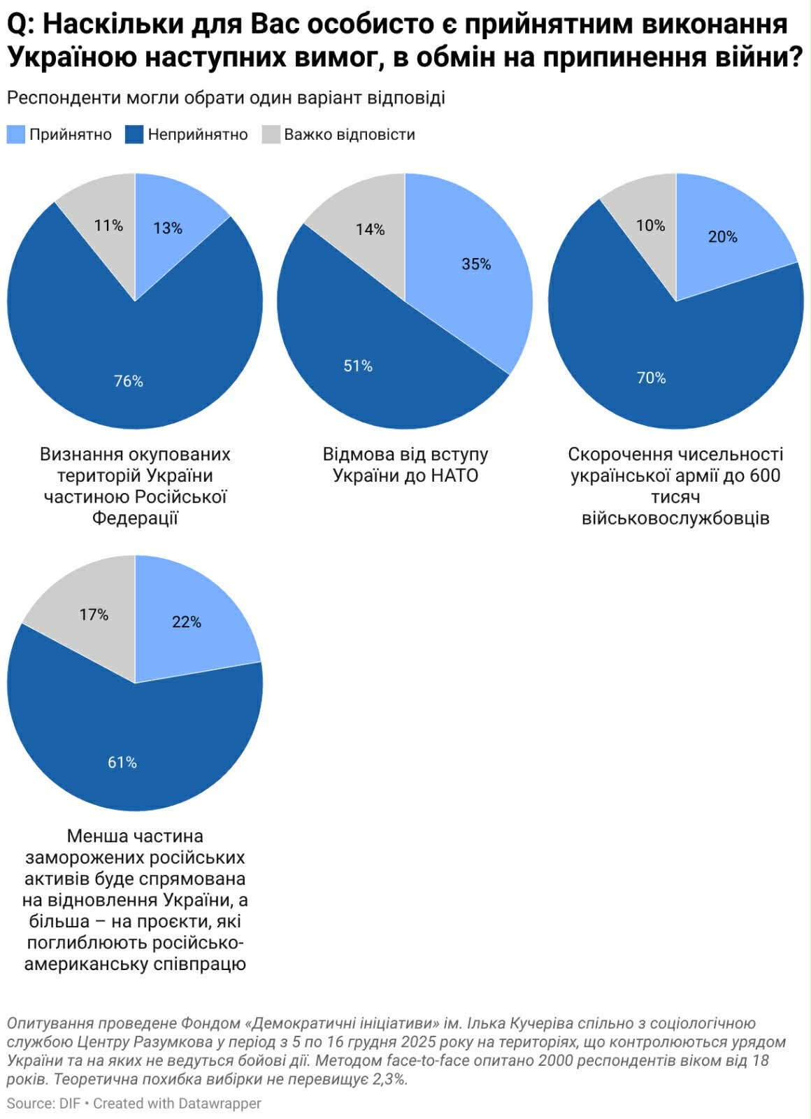 Водночас важливо, що Україна не підписала жодних капітуляційних рішень. Але мене серйозно турбує ризик спільного тиску з боку США і Росії – зокрема у вигляді розмов про виведення українських військ із Донбасу або територіальні поступки. Українське суспільство категорично проти такого сценарію, що підтверджують і опитування КМІС, і Фонду «Демократичні ініціативи».