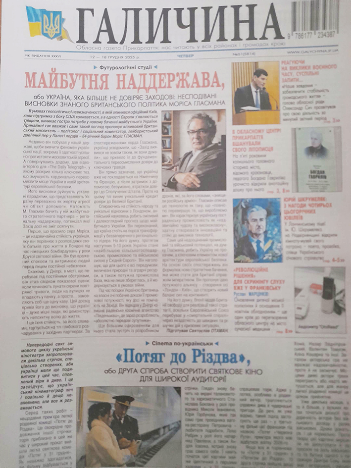 Тим часом і принагідно – короткий огляд випуску «Галичини» за 18 грудня. Відкриває номер публікація «Майбутня наддержава» під рубрикою «Футурологічні студії». В ній коротко знайомимо наших читачів з прогнозами одного з потужних гравців у міжнародному політикумі британського лорда Моріса Гласмана щодо місця й ролі України у світі в найближчій перспективі. А свої передбачення він сформував за результатами недавніх відвідин нашої держави з тим, аби, за його словами, вивчити основи української стійкості…