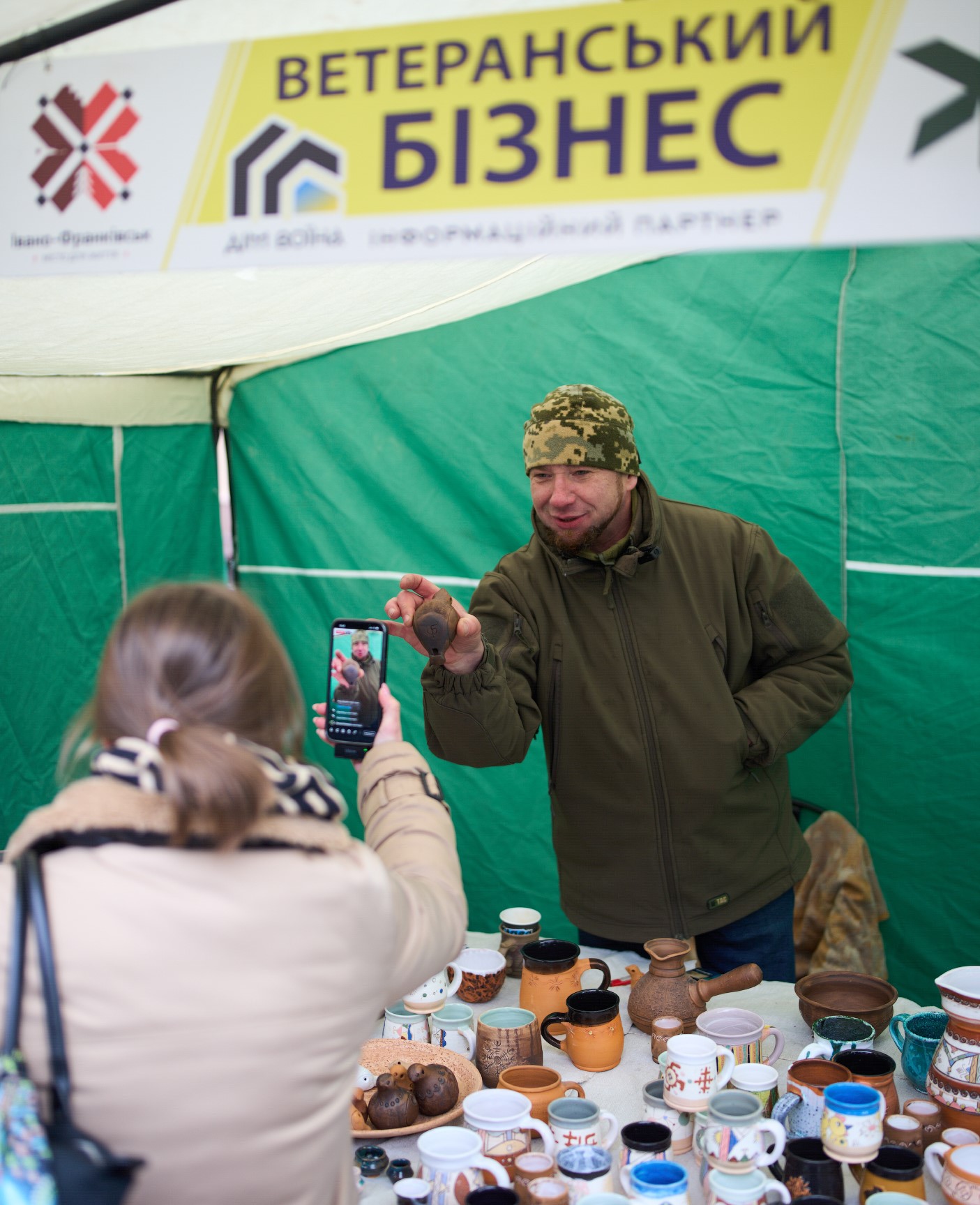 Учасник війни Віталій Владковський, який служив у 72-й бригаді і боронив Україну на донецькому напрямку, вже не вперше бере участь у ярмарках у середмісті Франківська. Його підприємницький напрям – гончарство, яким він почав займатися ще до війни, а після повернення з фронту взявся продовжувати свою справу.